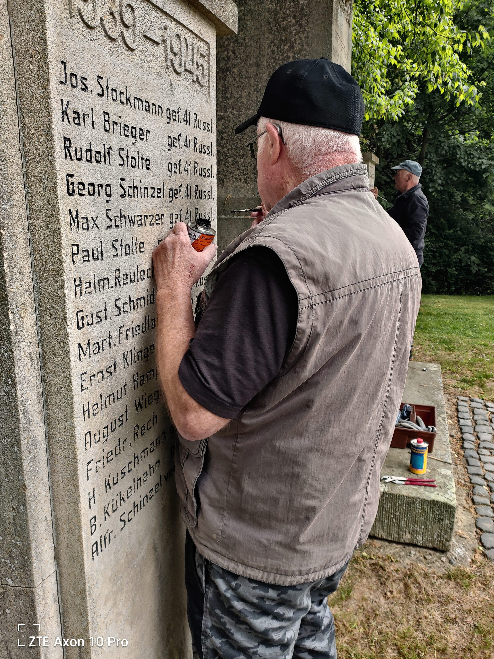 Unterstützung erhielt er dabei von Rudi Glasing und Christian Stolte, die sich im Rahmen einer gemeinsamen Pflegeaktion am Wappenbaum spontan zur Mithilfe bereit erklärten. Schritt für Schritt wurden die Namen der Gefallenen wieder sichtbar gemacht.