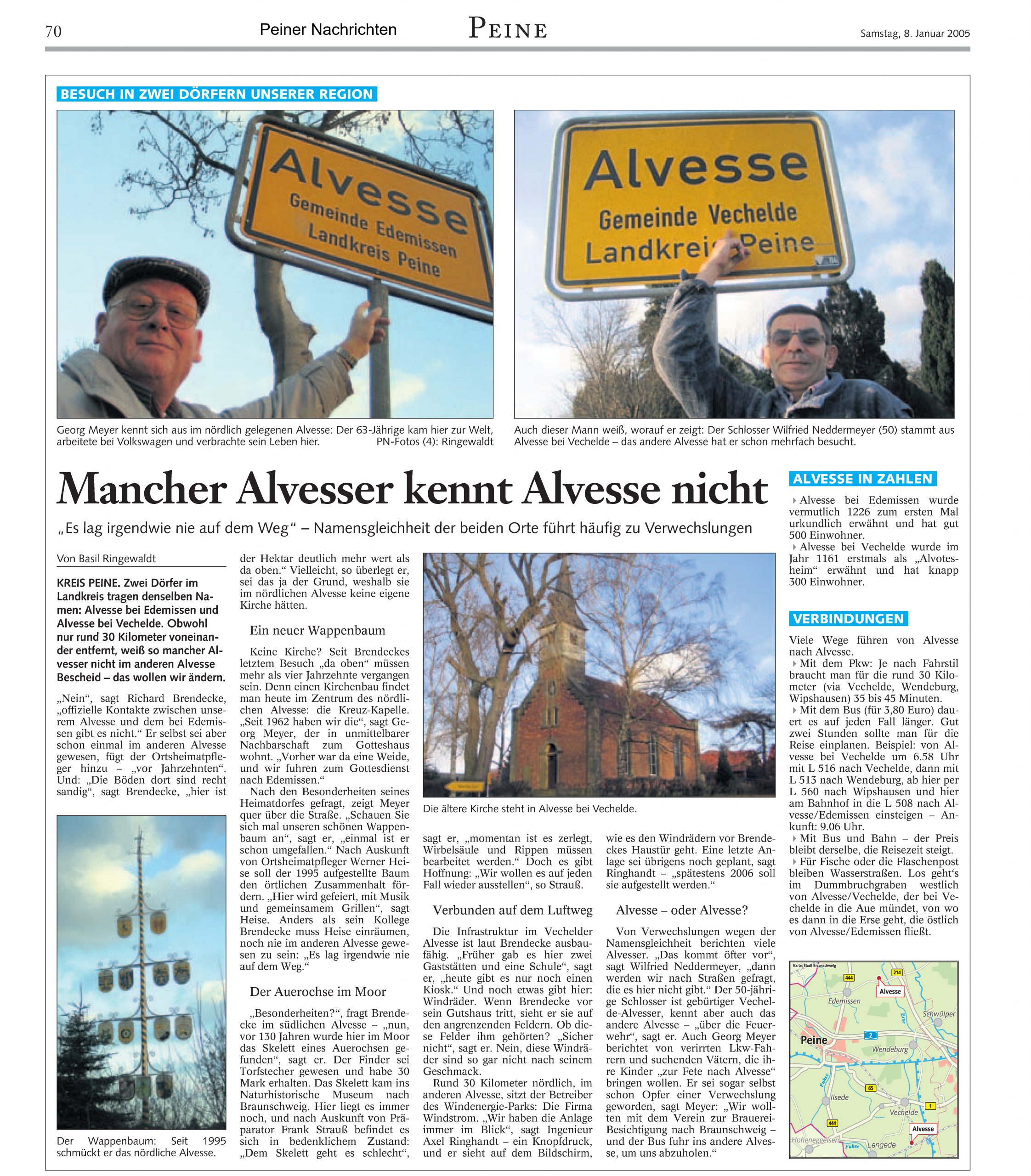 Alvesse/Edemissen. – Zum Vergleich: Alvesse bei Edemissen zählt heute 435 Einwohner und ist damit etwas größer als das gleichnamige Dorf in der Gemeinde Vechelde. Auch hier erinnert Geschichte an alte Zeiten: Eine Mühle, die früher auf der Papenhorst stand, wurde 1987 im Freilichtmuseum Hessenpark im hessischen Neu-Anspach wiederaufgebaut.